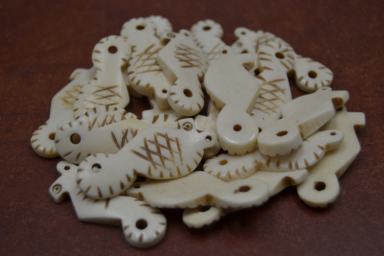It is carved out of buffalo bone. It is shaped as a seahorse. Nice additional to your jewelry making.