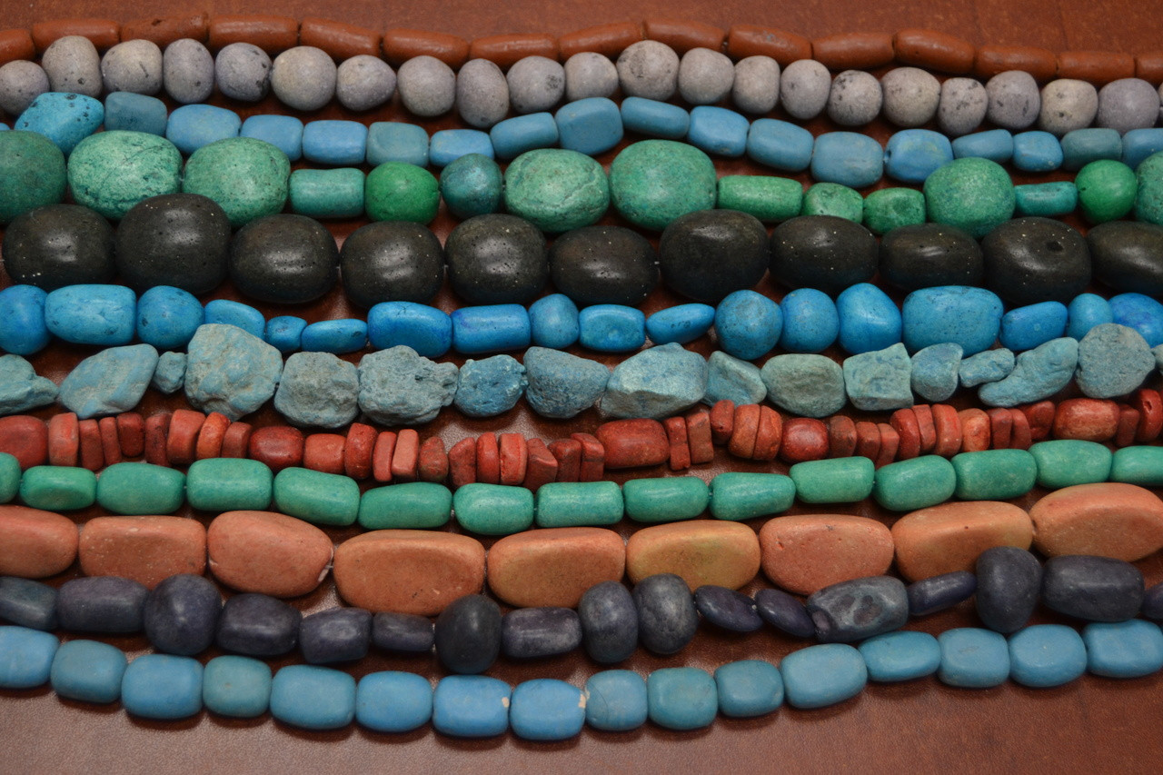 These are carved by hand and made out of clay. Nice additional to your beading craft.