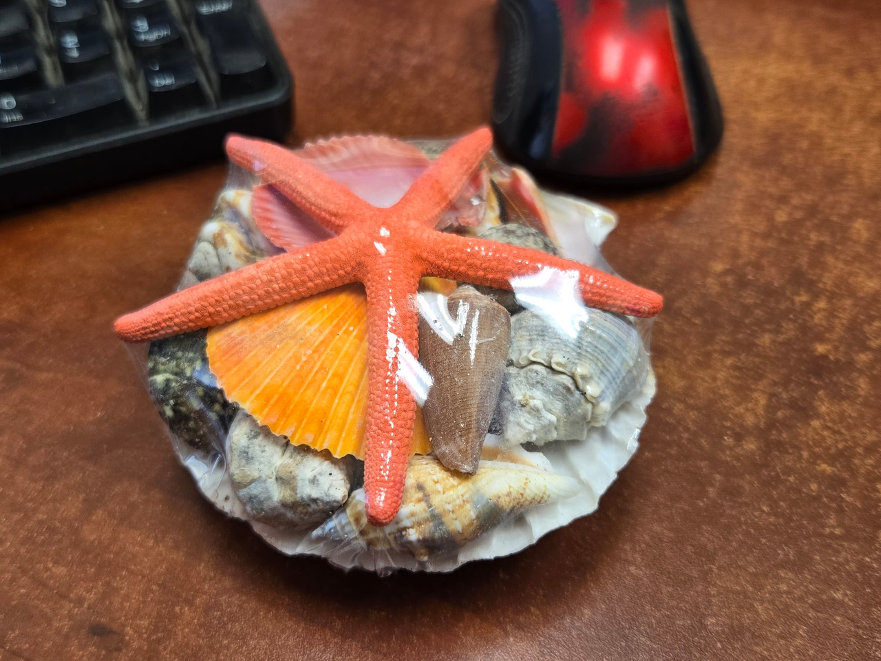 It is a nice basket of random seashell with a starfish. It can be nicely used as a gift.