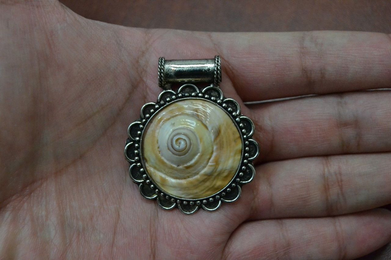 It is handmade conus shell pendant. The shell is carved and attached to silver plated pendant. Nice additional to your jewelry fashion.