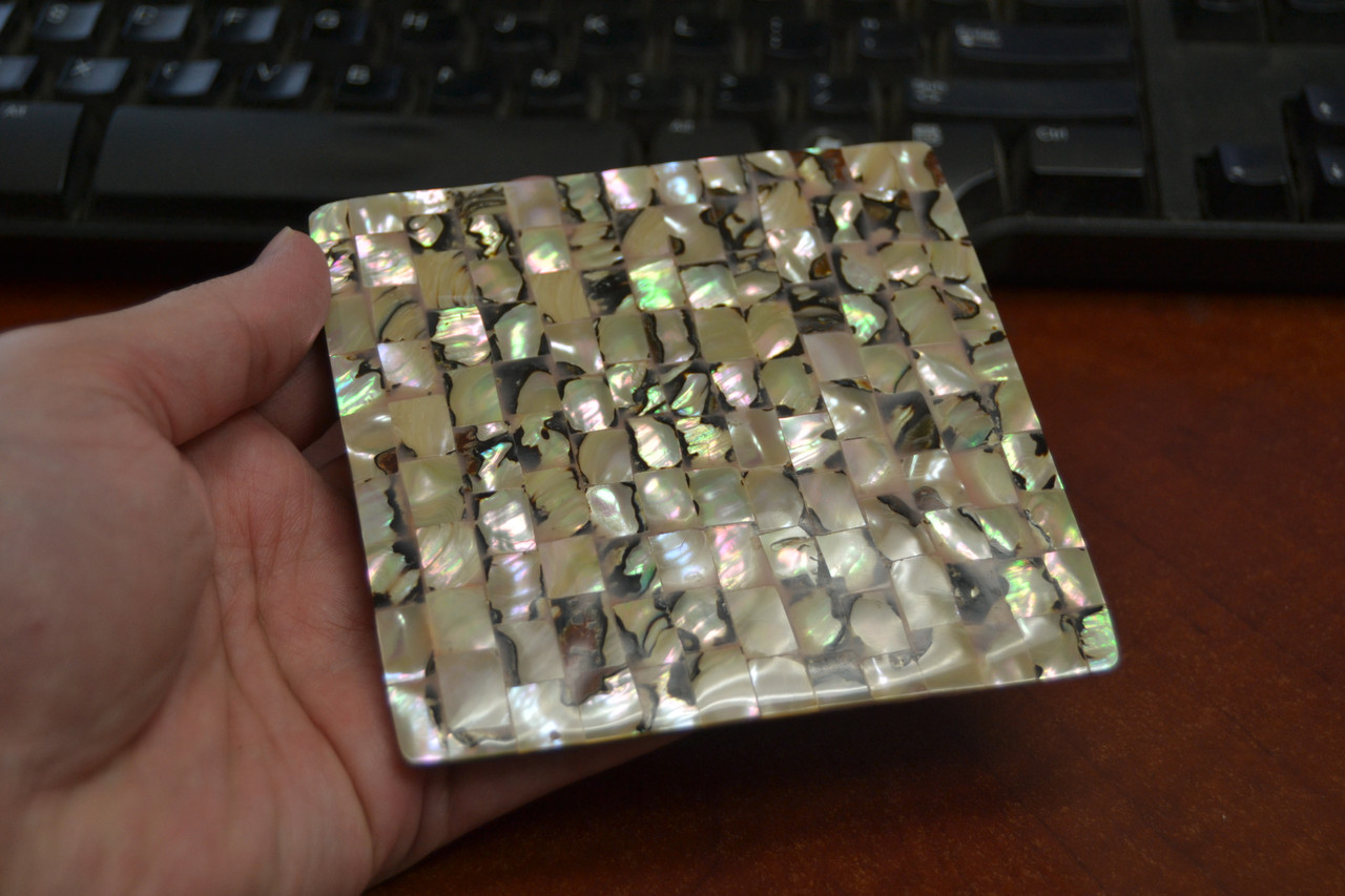 It is carved out of abalone shell and inlay onto plastic white back. It is mixed of shell pieces and the color pattern may vary.