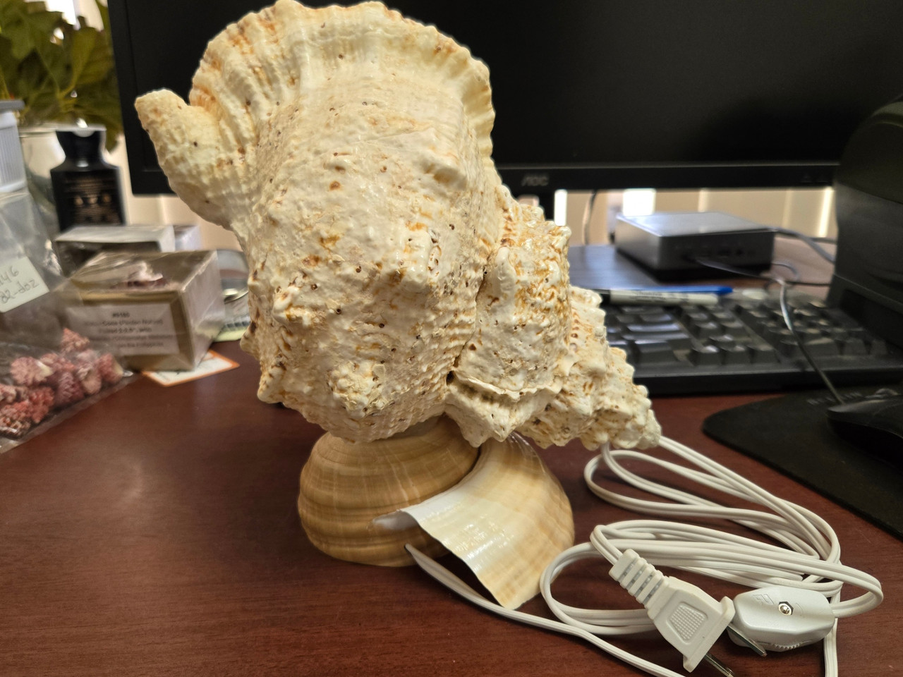 This is a beautiful table lamp. Just plug it into the wall socket and see it glow. It can be used in your kitchen, bedside, or bathroom, and is a nice addition to your seashell collection. The sizes and markings may vary slightly, as this product is naturally produced. It also includes a light bulb cord. The cord is 6 feet long and has a 7-watt light bulb.