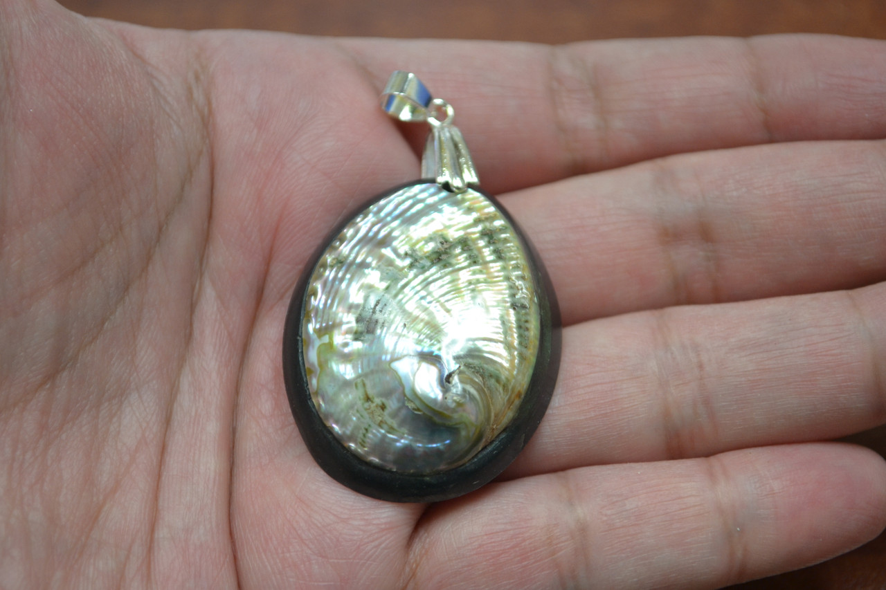 It is handmade shell pendant. The shell is carved and attached to the plastic black back. Nice additional to your jewelry fashion.