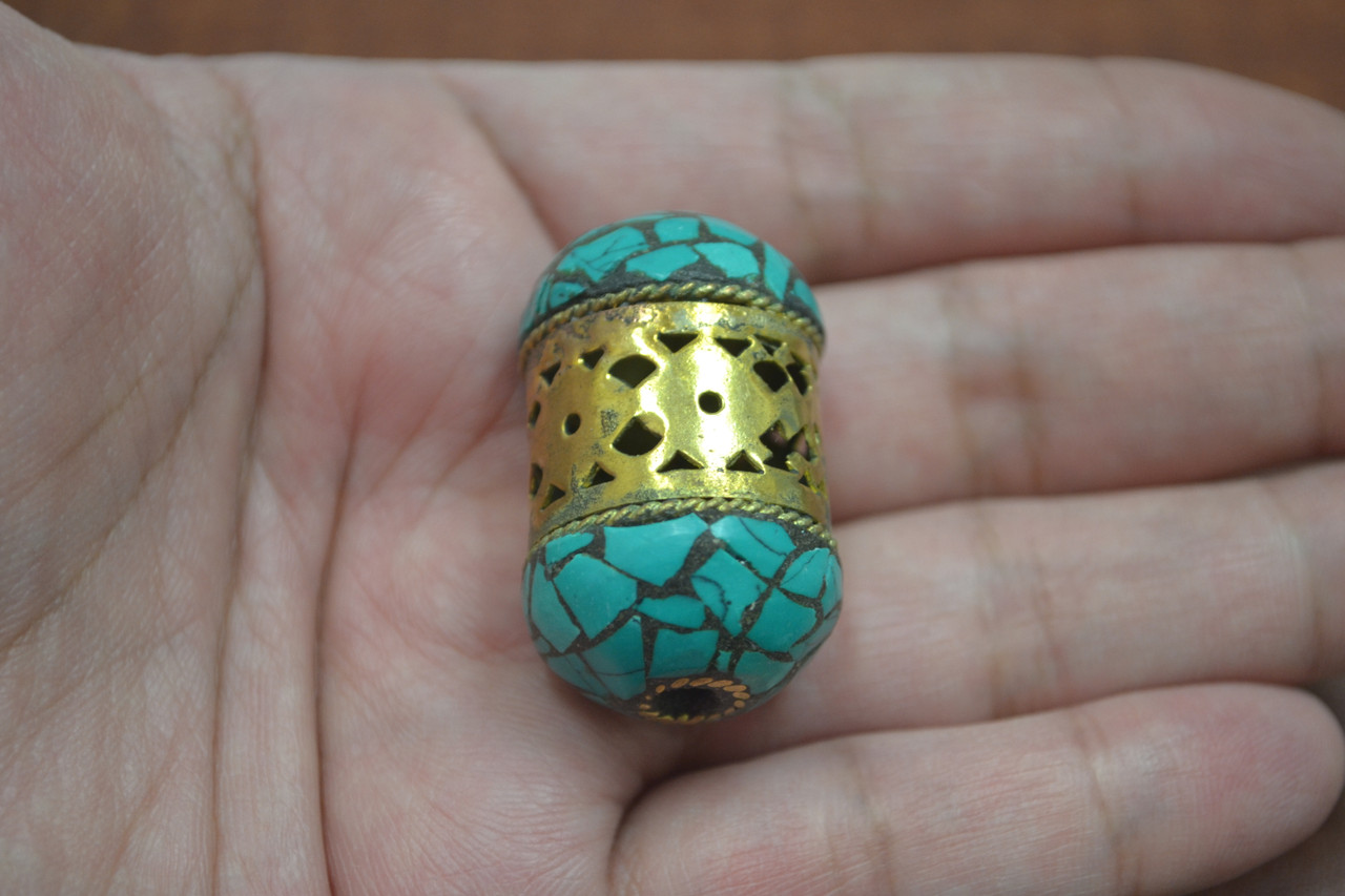 It is made out of green turquoise shell. It attached with gold plated stripe on it. Nice additional to jewelry making or crafts.