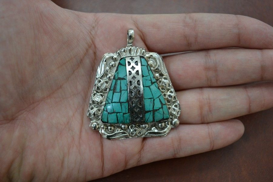 It is carved out of turquoise stone and made into a beautiful pendant. Nice additional to your jewelry collection.