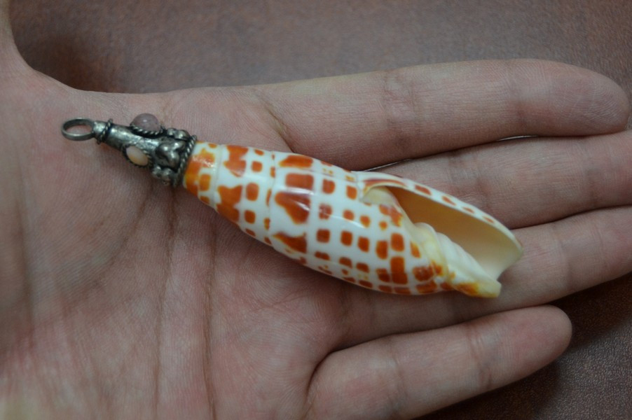 It is handmade shell pendant. The mitra episcopalis shell is capped with agate gemstone brass. Nice additional to your jewelry craft.
