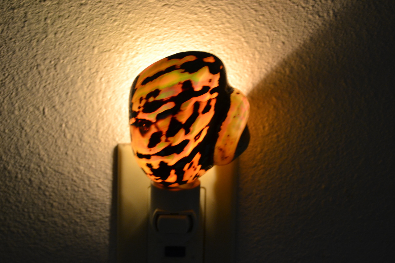 This is a beautiful brown sarmaticus seashell nightlight. This is real made from natural shell. Just plug into to the wall socket and see it glow. It can be used for your kitchen or bathroom. Also, a nice addition to your seashell collection. The sizes and markings will vary slightly, as this is produced by nature. You will receive similar one.